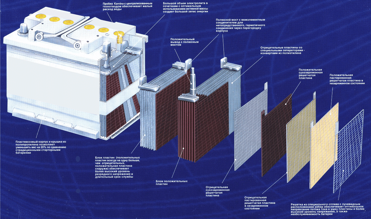 Современная аккумуляторная батарея состоит из следующих основных частей: